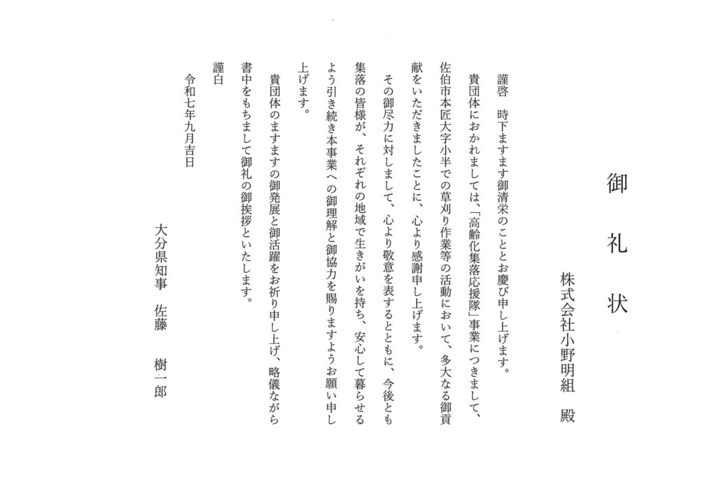 大分県知事より感謝状をいただき、誠に光栄です 。今後とも、集落の皆様が安心して暮らせるよう、微力ながら尽力してまいります 。